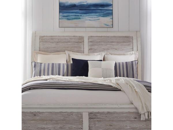 This king sleigh headboard is crafted from Poplar solids and Spruce veneers in a Weathered White and Parchment Brown finish. It features a gracefully rolled cap rail and planked accents with a high-low veneer for added texture.