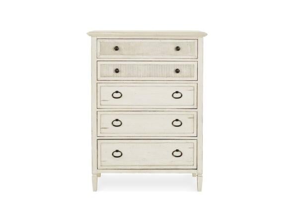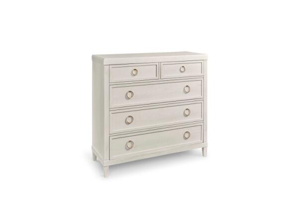 Five-drawer chest with self-closing guides and ring pulls for easy use. Cedar-lined bottom drawers and dust dividers; offered in Shell White or Chalk Slate.