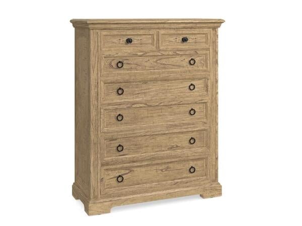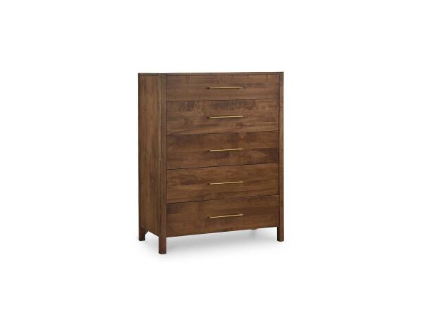 Five‑drawer chest in solid American Cherry with hammered pilasters and an intricately shaped base. Dovetail drawers with soft‑close guides; anti‑tip kit included.
