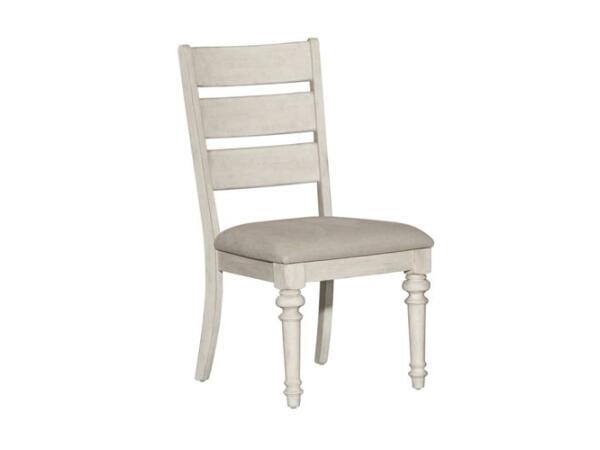This Whitney slat back side chair combines English country charm with a linen upholstered seat and a turned cap rail. Crafted from rubberwood solids, it features turned front legs and a distressed antique linen and weathered gray finish.
