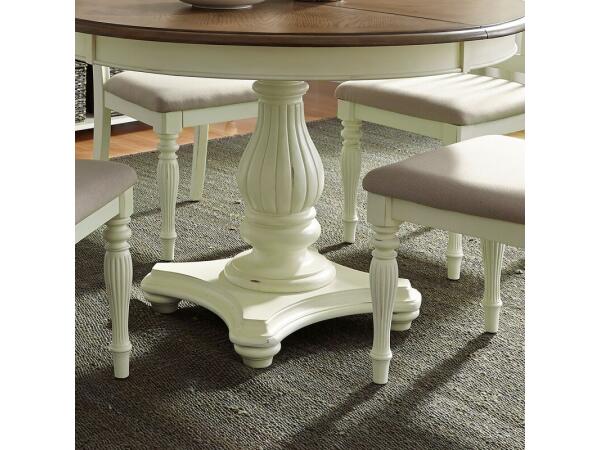 This Cumberland Creek pedestal table base is crafted from acacia and cashew solids with white oak veneers, featuring a buttermilk finish with rub-through. It boasts a turned, fluted design for a farmhouse living style.