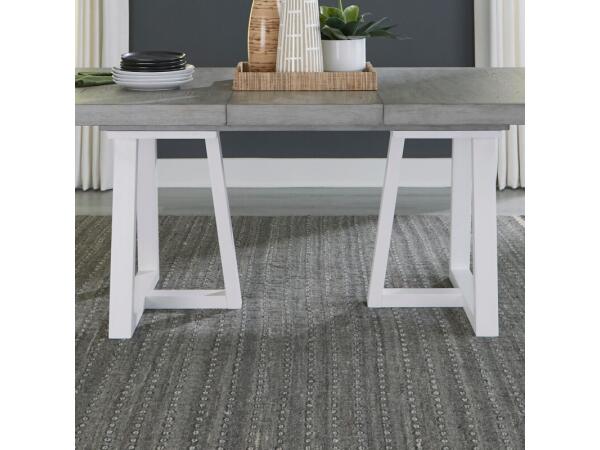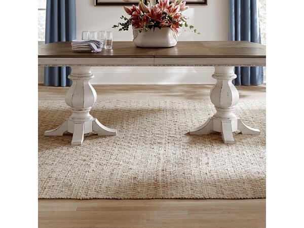 This Palmetto Heights double pedestal table base, crafted from rubberwood solids, features a Shell White finish. It provides openness and clean lines, perfect for a contemporary dining space.