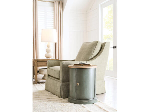 Crafted from Eucalyptus solids and Ash veneers with a wire brushed Turquoise finish and Spice wood tone top, this 56" accent cabinet features three mirrored doors with decorative floral pattern overlays. It includes a concealed fixed shelf for storage.
