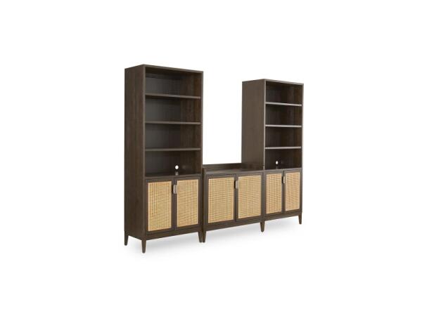 Modular wall storage in toasted oak with framed cane doors for coordinated display and organization. Adjustable shelves and wire management adapt to your layout; 104 in. W x 19 in. D x 82 in. H.