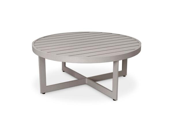 Commercial-grade aluminum outdoor round cocktail table with slatted top and X-base; built-in levelers help keep drinks steady. 38 in. diameter x 16 in. H.