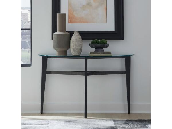 This Modern View sofa tabletop is crafted from metal with split heart oak veneers and features a gauntlet gray finish. It includes wirebrush distressing and dark pewter metal legs, designed to pair with its base.