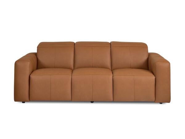 Leather power reclining sofa with zero-gravity positioning, adjustable headrests, and a USB port. Broad padded arms and a low, relaxed profile offer contemporary comfort.