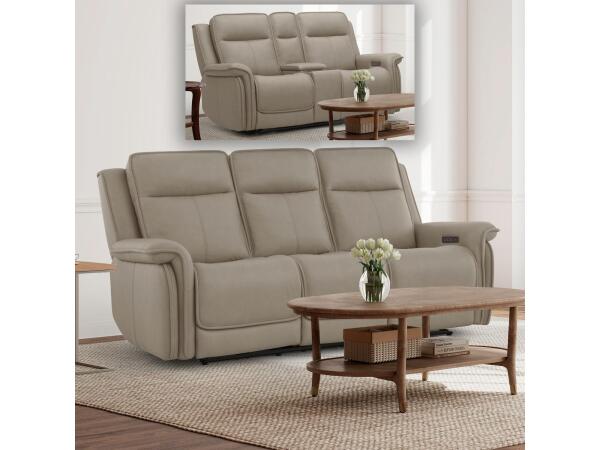 This living room set includes a power reclining sofa and loveseat, both offering triple power adjustment for the headrest and lumbar. The set features memory foam seats, USB charging ports, and a loveseat console with a wireless charging pad.