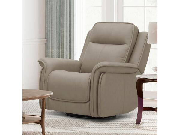 Experience customized comfort with this swivel glide recliner, featuring triple power recline for the headrest, lumbar, and seat. It includes contoured seats with a waterfall chaise and a side-mounted control panel with USB and USB-C charging ports.