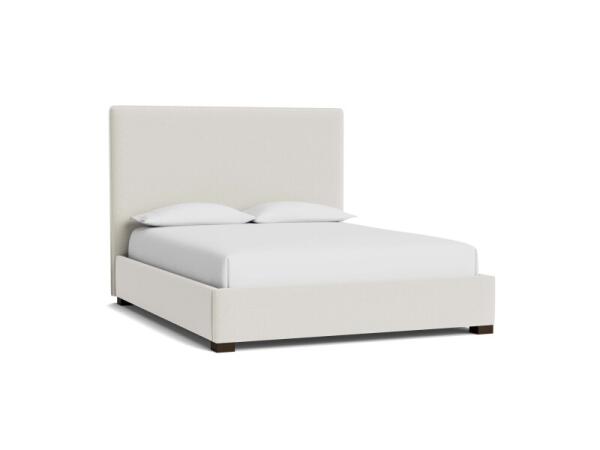 An upholstered platform bed in soft neutral fabric with a low-profile, flange-welted headboard and clean block legs. No foundation required; available in multiple sizes.