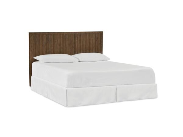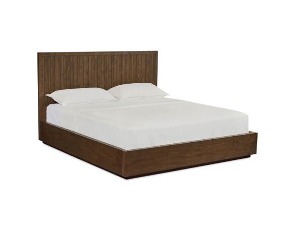 Modern panel bed with textured oak reeding and a sleek plinth base for a floating look. 50 in. H x 64.5 in. W x 86 in. D; available in Queen, King, and California King.