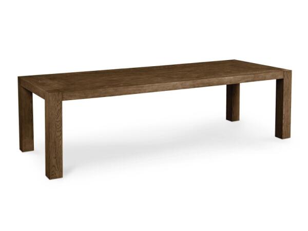 Parsons-style dining table featuring a textured oak veneer top and flush square legs. The geometric grain pattern brings a modern, organic look to the dining room.