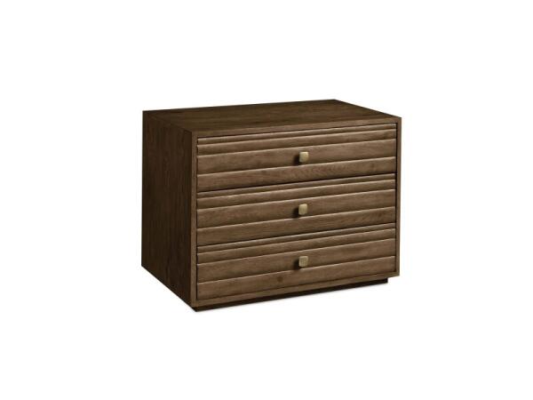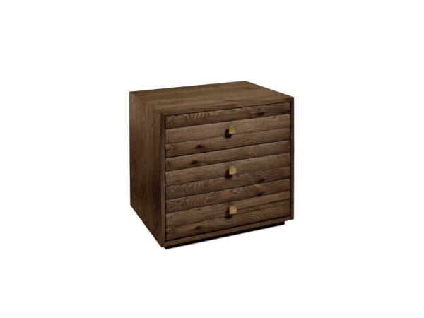 Modernist 5-drawer chest in irregularly planked oak with horizontal reeding. Two half drawers sit above three full, floating on a plinth base with sand-cast pulls.