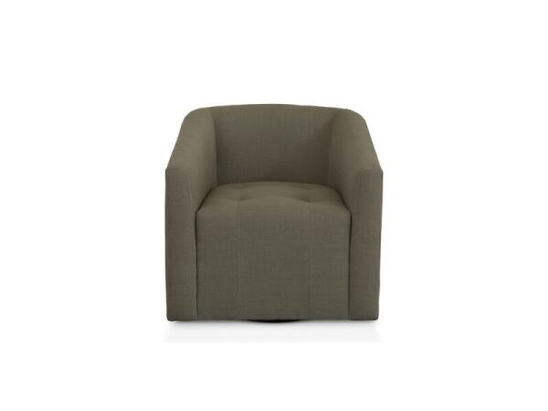 Compact barrel swivel chair with a tufted waterfall seat and concealed swivel base for smooth, cozy seating. Upholstered and versatile for nooks or bedrooms; 34 in. W x 32 in. D x 29.5 in. H.