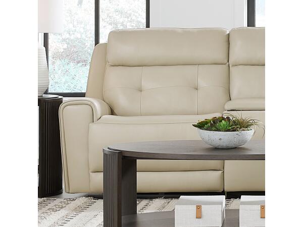 The Carrington sofa features a durable hardwood frame and is upholstered in Semi-Aniline Top Grain Leather in a Baja Stone finish. It offers triple zero gravity power recline with an articulating headrest, powered lumbar support, memory foam seats, and in