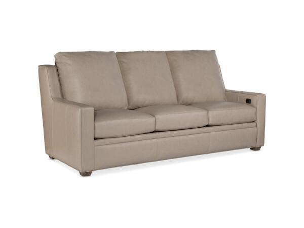 Power-reclining leather sofa with full recline and an articulating headrest. Spring Down cushions and even-load seating support enhance comfort and durability.