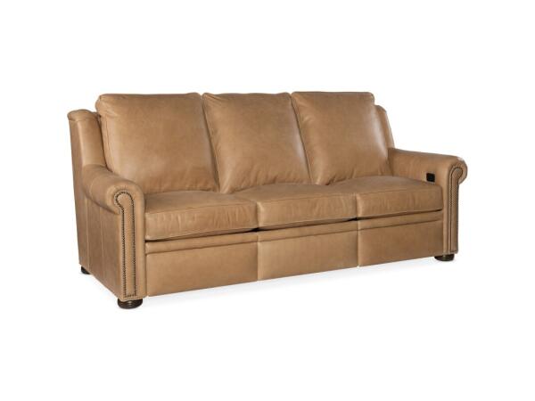 Traditional leather reclining sectional with Spring Down cushions for plush, resilient comfort and loose back cushions secured with Velcro. Built on a laminated hardwood frame with mortise-and-tenon joints; one-piece back.