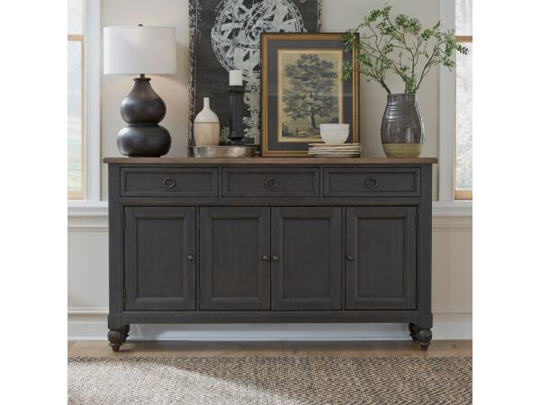 The Americana Farmhouse hall buffet, with a dusty taupe top and weathered black base, features three full extension felt-lined drawers and four framed doors. It includes one adjustable shelf behind each door, crafted from Poplar and Rubberwood solids.