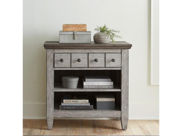 Crafted from rubberwood solids with white oak veneers, the Heartland drawer end table features an antique white and planked tobacco top finish. It includes a full extension drawer and a slat bottom shelf for storage.