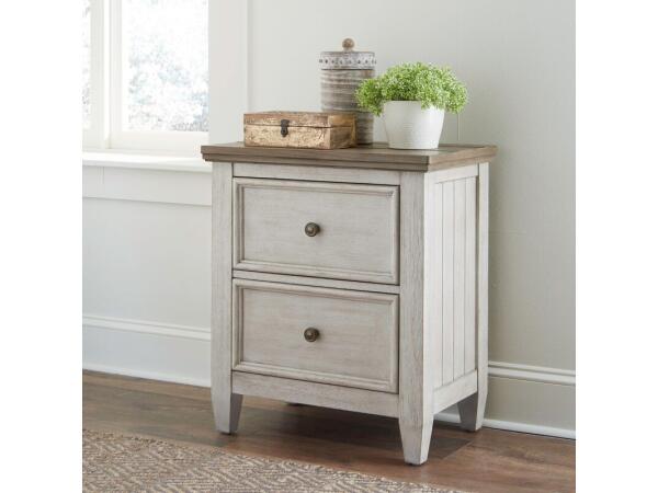 This Heartland 2-drawer night stand features a distressed antique white and tobacco top finish on rubberwood solids. It includes a 2-port charging station with plugs and USB ports, felt-lined top, and cedar-lined bottom drawers.