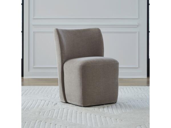 This versatile Truffle accent dining chair features full upholstery, pillowtop seat and back cushions, and casters for easy mobility. It provides comfort and sophistication, suitable for use as a dining, host, or accent chair.