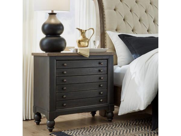 This Americana Farmhouse bedside chest in black and dusty taupe features bluff-cut drawer fronts and antique brass knob hardware. It includes a charging station with two power outlets and two USB ports, along with felt-lined top and cedar-lined bottom dra