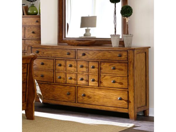 This rustic American 7-drawer dresser features select hardwoods with ash and oak veneers in an aged oak finish. It offers ample storage with bottom case dust proofing, full extension metal glides, and antique brass knob hardware.