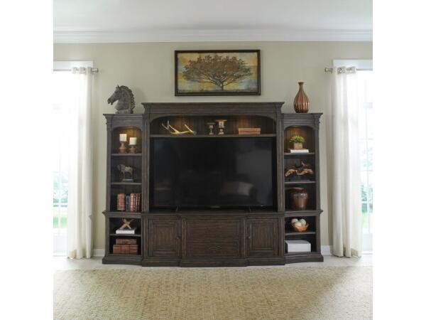 The Paradise Valley entertainment hutch is crafted from rubberwood solids and white oak veneers with a saddle brown finish. It features heavy top crown, chamfered pilasters, bead molding, touch LED lighting, and wire management provisions, perfect for cre