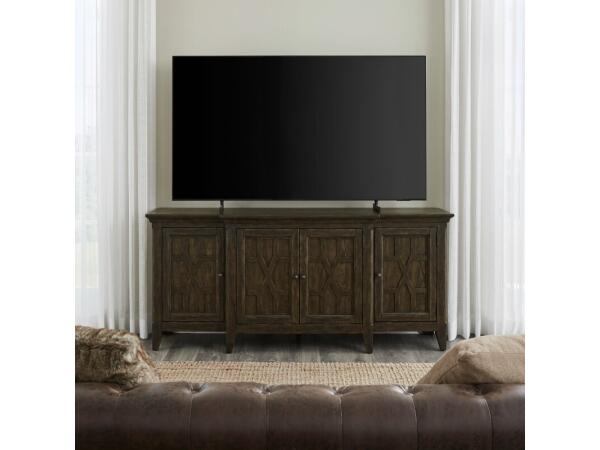 The Paradise Valley 76 inch TV console features rubberwood solids and white oak veneers in a saddle brown finish. It includes four wood framed doors with Chippendale fretwork overlays, adjustable shelving, and accommodates most 85" TVs.