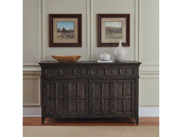 A rustic Paradise Valley buffet crafted from Rubberwood solids and Split Heart White Oak veneers with a Saddle Brown finish. It features two felt-lined drawers with soft-closing guides and a removable silverware tray, plus four doors concealing adjustable