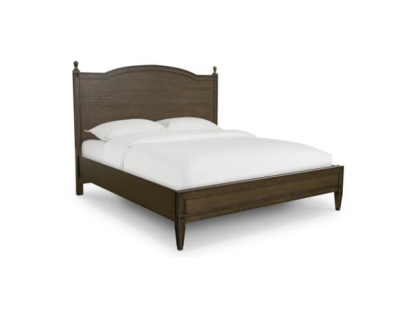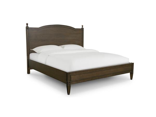 Classic panel bed with an arched wood headboard and low footboard, accented by carved rosettes and turned finials. Elm veneer highlights the grain in glazed, moderately distressed Tavern or Washed Elm finishes.