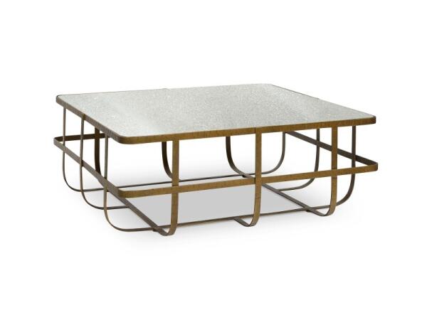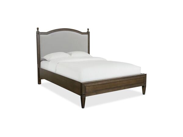 Upholstered bed with old-world details—carved rosettes and tapered legs—and elm veneer finished with moderate distressing and glaze, offered with low wood or tall upholstered footboard.
