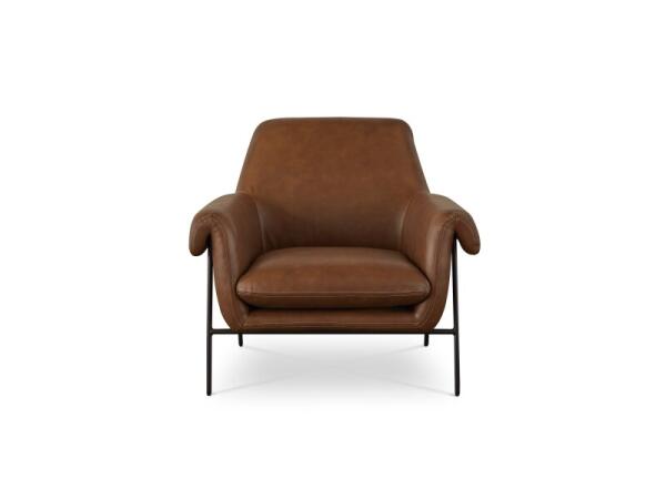Modern leather accent chair on a black powder-coated solid steel frame with generously padded seat, back, and arms. 38 in. W x 33.5 in. D x 34.5 in. H.