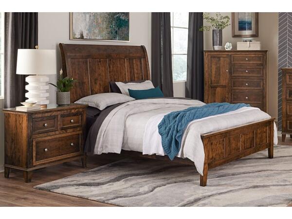 Queen mansion bed crafted from solid American oak and birch with mortise-and-tenon joints for lasting stability. Made in the USA with a tree-replacement program for responsible sourcing.