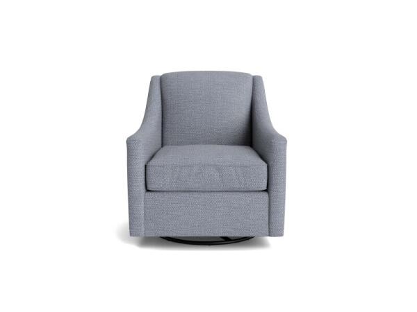Moderately scaled swivel glider chair with sloped track arms, a tight back, and a loose boxed seat. Fabric upholstery with neat welting offers enveloping comfort.