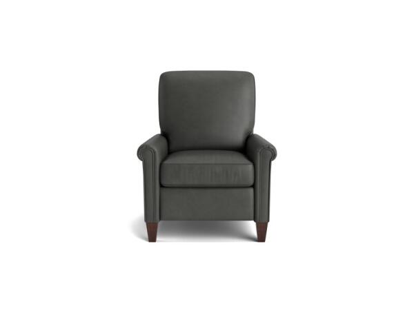Leather accent chair with rolled panel arms, tapered legs, and neat welt seams for transitional style. Semi-attached back and loose seat; 41 in. H x 33.5 in. W x 38.5 in. D.