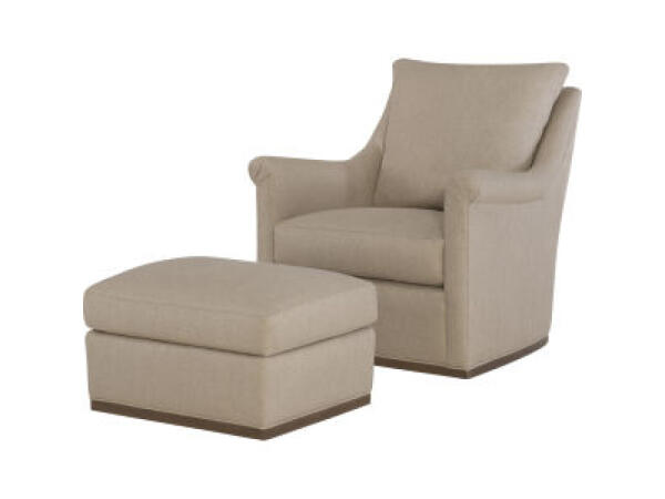 Panel arm swivel glider chair with clean lines, a semi‑attached back, and a loose seat cushion for easy comfort. Transitional style suits living rooms, bedrooms, or nurseries.