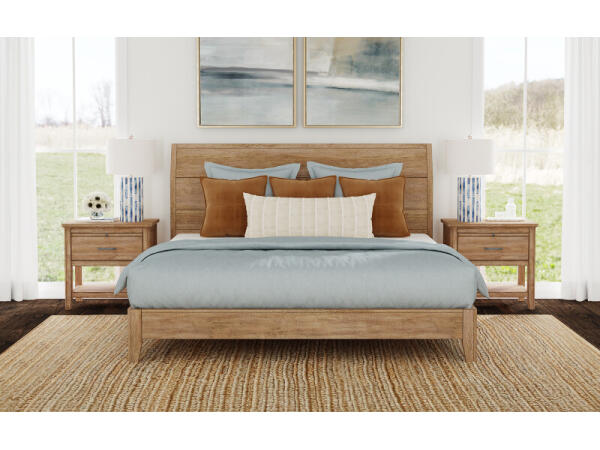 King upholstered bed made in the USA from solid American white oak with mortise-and-tenon construction for strength and stability. Supports sustainable forestry through a tree-replacement program.