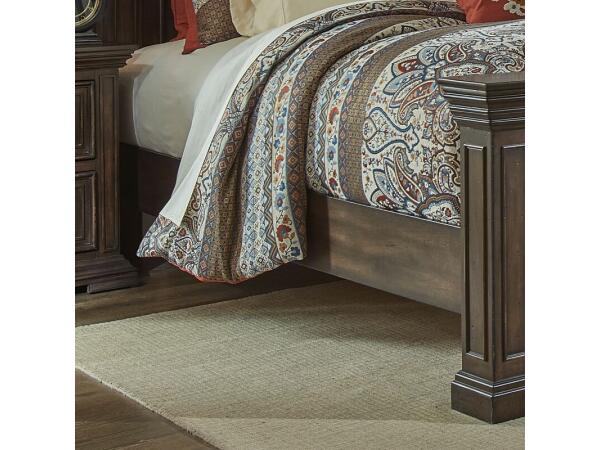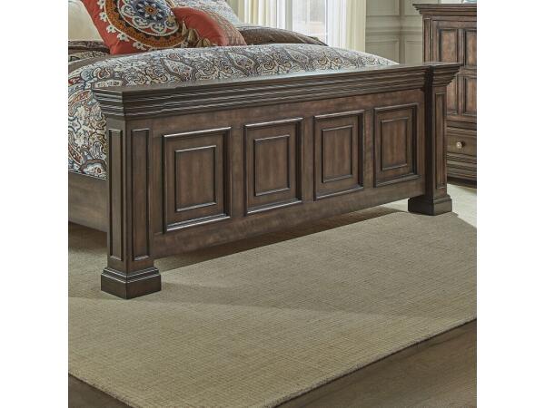 The Big Valley Queen mansion footboard is crafted from rubberwood solids with birch veneers and a distressed brownstone finish. It features a heavy top crown, raised panels with bead molding, large pilasters, square posts, and block feet.