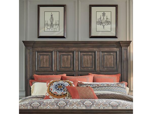 This Big Valley King mansion headboard, crafted from rubberwood solids with birch veneers, features a distressed brownstone finish. It is accented with heavy crown molding, windowpane details, graduated bead molding, square post pilasters, and block feet.