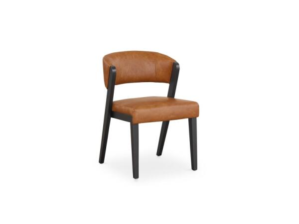Curved-back faux leather dining chair with a generous seat and solid hardwood frame for comfortable dining or extra living-room seating. Vegan leather upholstery; Natural or Black frame finishes.