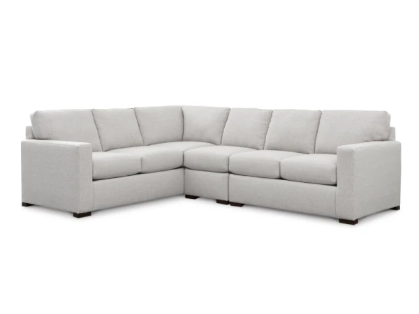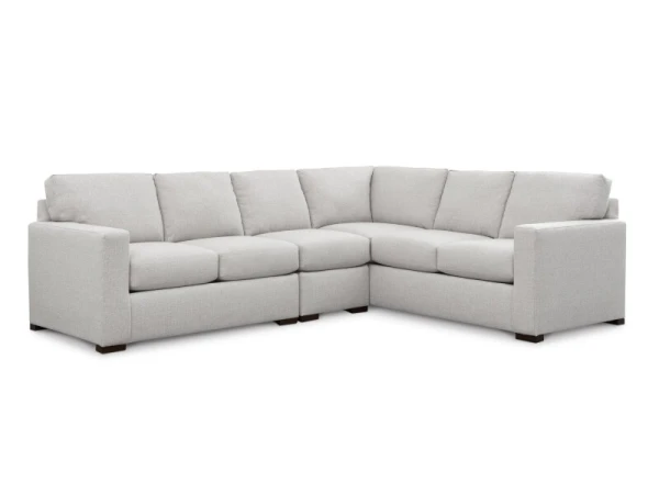 L-shaped sectional with attached boxed back and top-stitched seat cushions for supportive comfort, clean track arms, and low block legs. 113 in. wide for ample seating.