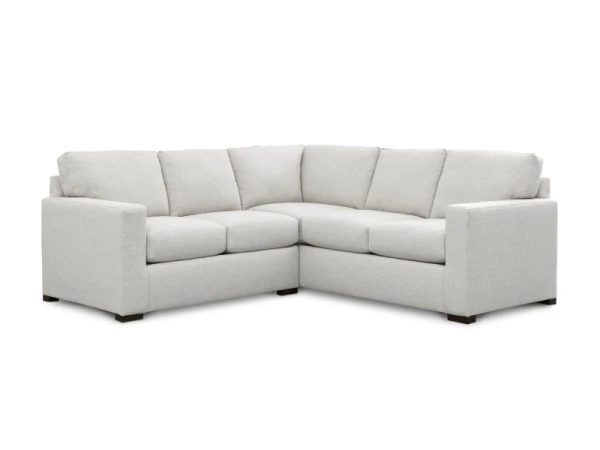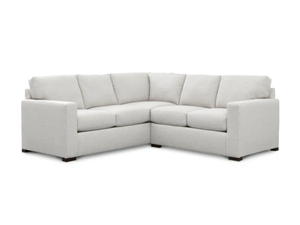 L-shaped sectional with a compact 2-cushion design, attached boxed back and top-stitched seat cushions, clean track arms, and low block legs. 90 in. wide to suit smaller spaces.