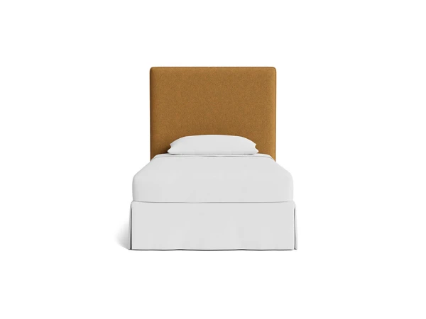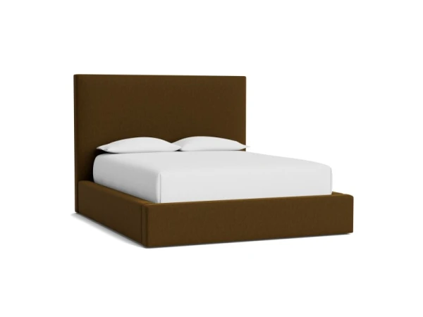 Upholstered platform bed with a lavishly cushioned, low-profile headboard and clean-lined frame on low block legs. Choose from upholstery fabrics to tailor a modern bedroom centerpiece.