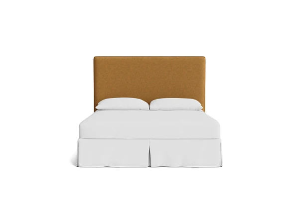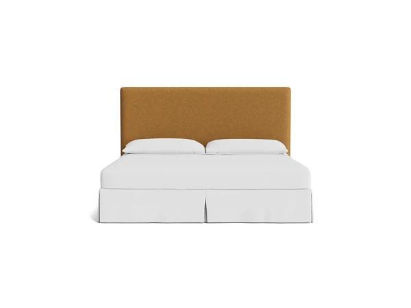Low-profile upholstered bed with a thick, plush frame and fully upholstered headboard for a tailored look. Fabric construction and low-block legs create a modern bedroom centerpiece.