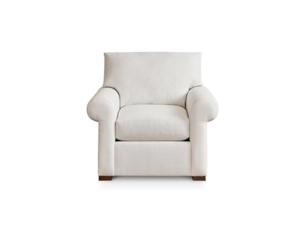 Transitional arm chair with a soft attached bed pillow back, generous roll arms, and low block legs in Brindle. Reversible top-stitched seat cushion; 40 in. W x 37 in. D x 37.5 in. H.