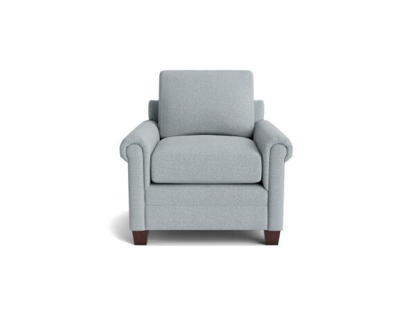 Fabric panel-arm accent chair with removable back cushion and tapered legs; customizable upholstery, cushion comfort, and leg finish. 36 in. W x 37 in. D x 37 in. H; artisan crafted in the USA.