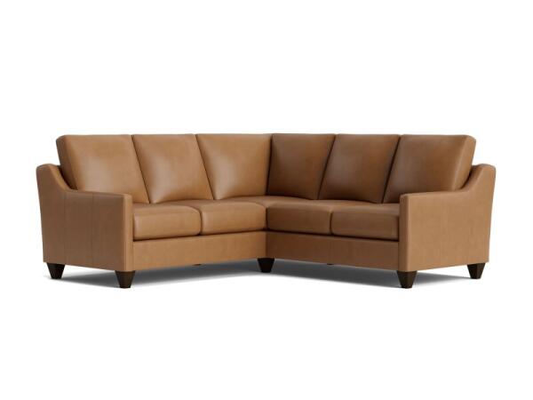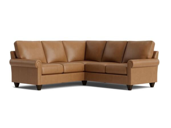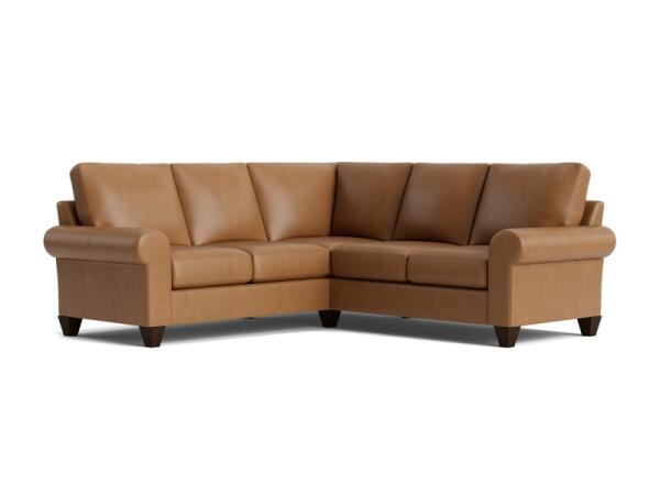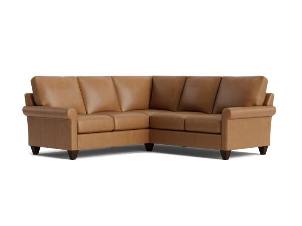 Custom leather L-shaped sectional with classic roll arms for enduring comfort and style. Choose from leathers, cushion options, and details; removable back cushions.