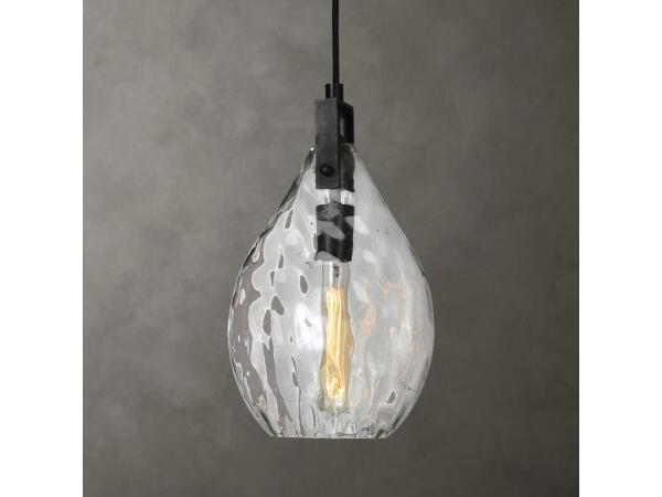 Transitional pendant in a matte black finish with a flat clear teardrop-shaped watered glass. From the front view, it is