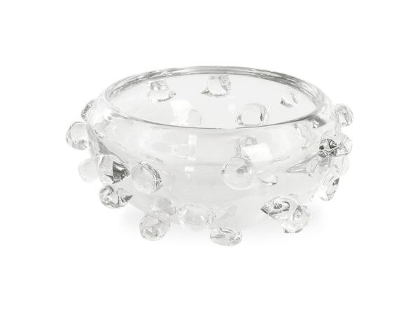 Enhance your home decor with our thick clear glass bowl, adorned with organic glass spheres accenting the surface. This stunning